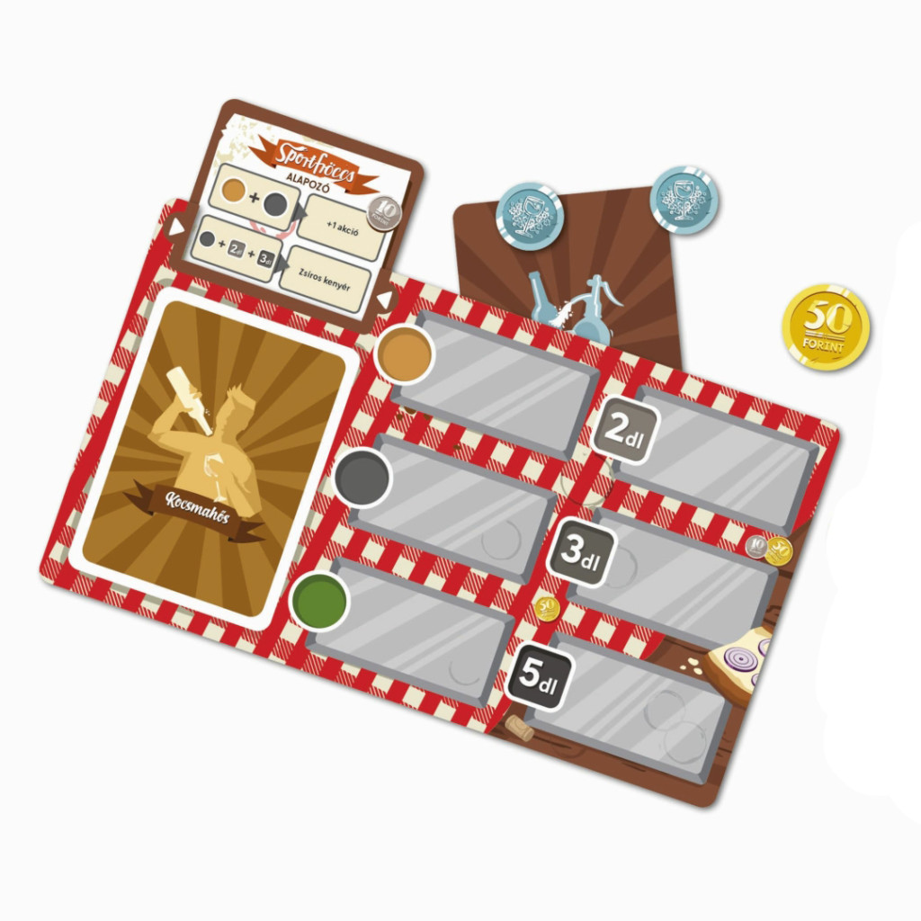 Élj át újabb mámorító izgalmakat, miközben kocsmacélokért versengve, Nellike, Árpádvezér, Géza bá és a többiek segítségével adod el frissítő fröccseidet!Tegyétek még izgalmasabbá a közös fröccsözéseket a vadonatúj kocsmacélokkal és 6 új kocsmahőssel. Mostantól nem mindegy, hogy mikor milyen fröccsöt kevertek ki és adtok el. A győzelem kulcsa a pontos időzítés. 4 különböző játékmódban mindenki megtalálja a neki megfelelőt, azok is, akik nem szeretnek konfrontálódni, de azok is, akik imádják szívatni egymást. Egészségetekre!„Kifejezetten profi, szórakoztató és vicces játék. Könnyen játszható nagyobbacska gyerekekkel, ám baráti társaságokban is biztos, hogy alapkelléké válik.” – Index.hu„Menő a társas, szuper a játékélmény, nagyon szép a grafika!” – RTL reggeli„Pörgős, vicces és legfőképpen szórakoztató játék. Ideális a strandra, vagy éppen este fröccsözés mellé.” – Telex.huEz egy kiegészítő. Használatához szükség van a Fröccs alapjátékra.